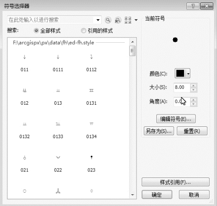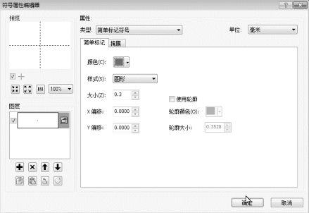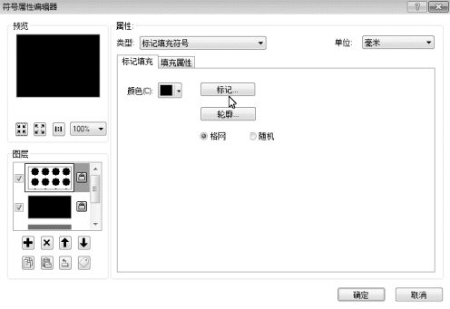 (2)复制增加一个图层,在属性的“类型”中选择“标记填充符号”(图5.20)。点击“标记”,打开“符号选择器”对话框,选择一个点,如图5.21。点击“编辑符号”,打开“符号属性编辑器”,设置填充颜色(R,G,B值分别为140,80,60),样式设置为圆形,大小设置为0.3,具体如图5.22所示。