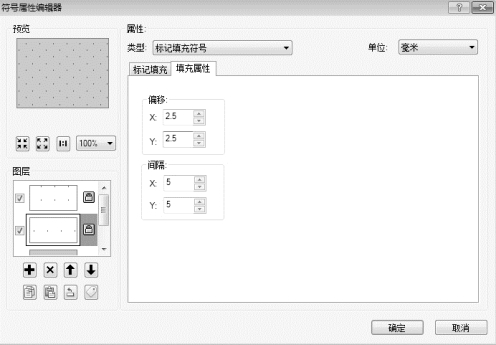 (3)点击“确定”,再复制一个图层,在“填充属性”中,将前两个图层的标记填充符号的XY间隔设置为5,XY偏移设置为2.5,具体如图5.23所示。