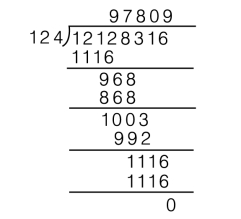 (3)除数的8倍只是个3位数,所以除数绝不能大于124。第7行与第8行是完全一样的(否则就意味着除不尽)。除数如果是123或比它更小,第7行的前2位数也必然得不到11。所以,除数既不能大于124,又不能小于124,那就只能是它了。