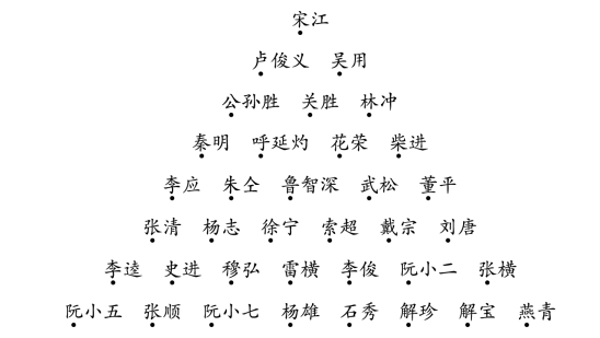 这家伙闯下大祸,拍拍屁股走了。真人无奈,只好替他料理后事。在整理地穴、打扫卫生时,发现禁闭36位天罡星的地方,整整齐齐摆着宋江、卢俊义等名字牌,好像现在火葬场里的亡灵牌子,上下共有八层,摆成一个正三角形: