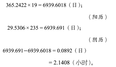 不难看出,19个“回归年”与235个“朔望月”的长度大体相等,仅仅相差0.0892日(连日还不到),所以在19年中需要设置7个闰年(19×12+7=228+7=235)。
