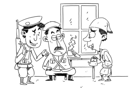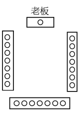 伙计和店小二们在大堂里沿着墙壁分别摆下桌子,一共摆了4张。老板显得特别好客和热情,请官兵们分别就座:每张长桌坐7人,其中有准尉、上士、中士、下士、一等兵、二等兵和列兵。老板自己朝南坐,如右图。宾主坐定以后,马上开始大嚼。