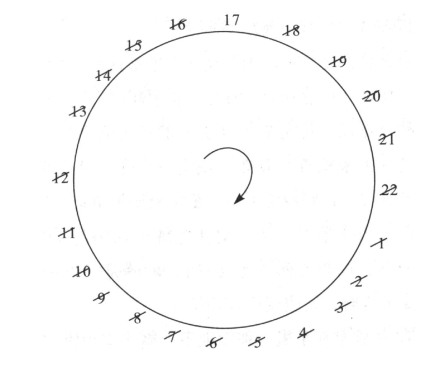 从1开始,按顺时针方向点数,每数到第7人,就叫他出局。如下图,不难看出,出局的人,其先后顺序将是: