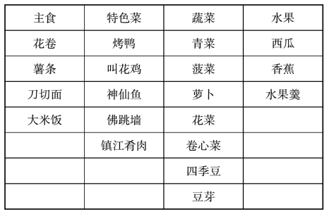 第一天的菜单可根据每一类的第一种排出,即第一天的菜单是花卷、烤鸭、青菜、西瓜,次日就换到第二种。当某一类的所有项目通通轮过一遍之后,便从最上面一种重新开始。比如,某一天的菜单是大米饭、佛跳墙、卷心菜和水果羹,那么,下一天的菜单便是花卷、镇江肴肉、四季豆与西瓜。