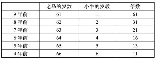 做这个算术游戏题,其实还有更简单、更直截了当的办法——因为老马和小牛的年龄之差是永远不变的。