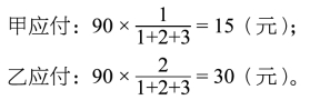 处乙也下车了,最后,仅有丙一人坐到终点,共付了90元车钱。请你算算,甲、乙两人应付给丙多少车钱才合理?