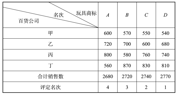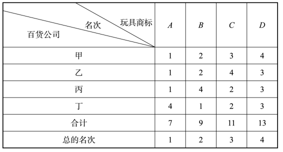 一家玩具公司生产了一种能歌会舞又能招待客人的“智能娃娃”。为了打开销路,公司设计了4种产品,它们具有不同的式样和包装,并分别贴上A、B、C、D,4种商标,看一看到底哪种产品的销路最好。他们选择了4家规模和营业额等各方面条件都差不多的百货公司作为调查对象,要求这4家公司对上一年度4种产品的销售情况排定一个名次,哪种商标的货色最畅销,就定为第一名,然后依次排下去。