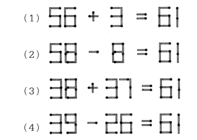 在上面每一道小题中,要求你只能移动一根火柴棒,而使算式成立。右边的答案统统都是61,雷打不动。