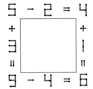在右下角搭成6的火柴棒中,移走一根到左上角去,使6变成5,5变成6。两个数目互换角色,4个式子就统统都成立了。