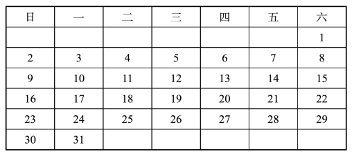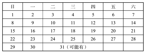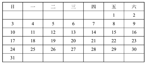 但是这张日历只有四个星期六,违反了题意“星期六和星期天的日数相同”。不过,我们已经找到解题的钥匙,只要对日历加以调整就行了。如果把该月的1日调整为星期六,那样一来,星期六和星期日的天数就相等了。然而,奇数日子的星期天只有两天而不是三天(表二),还是不合题意。