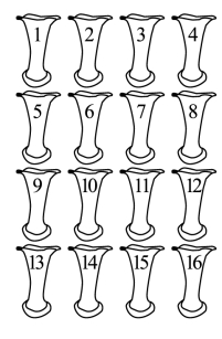 有一次,他在自己的办公室里,应同事们的要求编了一道新的智力题。他从邻近的桌子上取来16个空花瓶,分别在瓶上写好从0到15的16个编号,并把这些花瓶摆成方阵形状(见左图)。摆完后富兰克林对大家说:“请你们将这些花瓶重新布置一下,使瓶上的数字能组成这样一个幻方:横竖4行及两条对角线上的数字之和均为30。但有一个限制条件是,移动的瓶子数不得超过10个;当然,瓶子在同一行里的平移不在限制条件之列。例如,第二行里的5、6两个花瓶,从第一列和第二列分别平行移到同一行里的第二列和第三列就不算移动。”请问:这些瓶子应怎样移动?在移动过程中,有几只瓶子没有移动过?