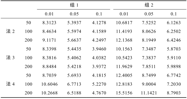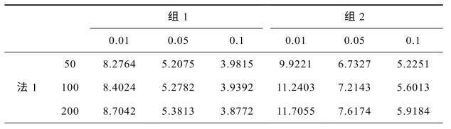 注:组1、组2分别在1%,5%及10%显著性水平下的渐近临界值为9.210,5.991,4.605以及11.341,7.815,6.251。本表为重复6000次得到的数值。