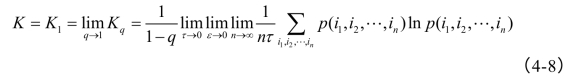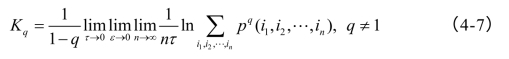 定义4-6对于一个动力系统,将其相空间分为各个边长为ε的小盒子,线,设p(i1,i2,…,in)为在第ik个盒子(k = 1,2,…,n)中的联合概率,则q阶Renyi熵定义为: