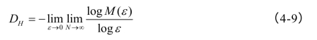 定义4-7 对于由点集组成的d维空间中的一个奇异吸引子,以d维的小格子εd覆盖整个吸引子,设所需格子数为M(ε),第k个格子中有Nk个点,pk=Nk/N,则定义盒维数(Hausdoff维数)为: