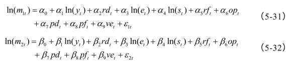 货币经济学文献中通常将影响货币需求的变量分成规模变量和机会成本变量。本书选择社会消费品零售总额y作为规模变量;选择我国银行间同业拆借加权平均利率rd、通货膨胀率pd为国内机会成本变量;在开放经济中,国际资本的流入形成了国外居民对本币的需求,因此还引入汇率e、汇率波动率ve、实际有效汇率s、国外利率rf和国外通货膨胀率pf作为国际资本流动的决定变量;随着我国经济开放度的增加,引入外贸依存度op作为制度变量。根据我国货币供应量的划分,可设定狭义货币(M1)和广义货币(M2)需求函数如下:其中m1,m2分别为季节调整后的实际的狭义和广义货币余额;ε1,ε2是平稳的误差项。
