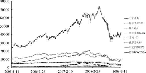 基于经济体和时区因素,本书考虑国际股市中主要发达国家(美国、日本、德国和英国)、近几年经济高速增长的“金砖五国”中三个国家(俄罗斯、印度和巴西),选取主要股票指数:上证综指(简记为:SZ)、标准普尔500(简记为:US)、日经255(简记为:JP)、法兰克福DAX(简记为:GM)、富时100(简记为:UK)、俄罗斯RTS(简记为:RR)、印度SENSEX(简记为:ID)和巴西BOVESPA(简记为:BS),样本数据为2005年1月11日至2009年3月27日的日收盘数据,剔除各股市未同时开市的日期样本,得到样本容量为814。各指数波动趋势如图6-8所示。