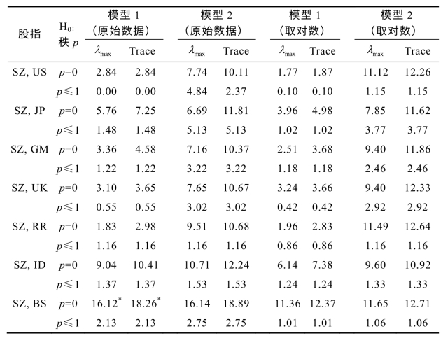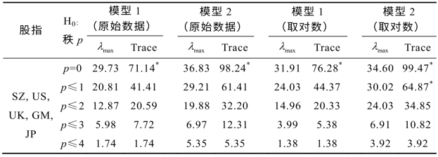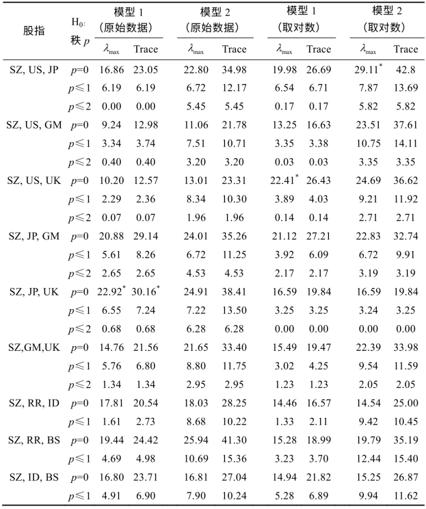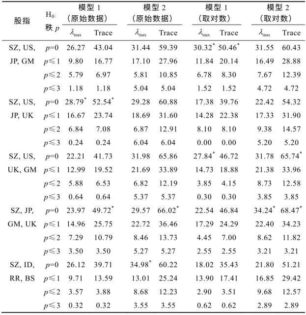 对于四股指的情形,各检验股指原始数据或取对数后的序列组合显示出具有一个线性协整关系。其中,较强的证据表明,原始数据序列(SZ,US,JP,UK)具有一个线性协整关系,取对数后的序列组合(lnSZ,lnUS,lnJP,lnGM)与(lnSZ,lnJP,lnGM,lnUK)具有一个线性协整关系;较弱的证据支持,原始数据序列组合(SZ,ID,BS,RR),(SZ,JP,GM,UK)以及(lnSZ,lnUS,lnUK,lnGM)存在一个线性协整关系。