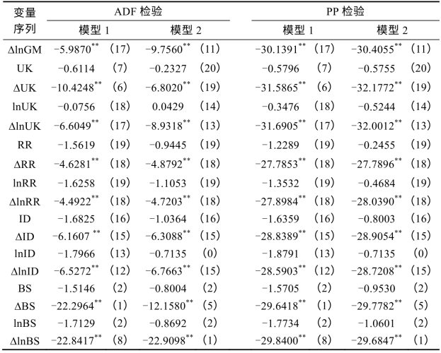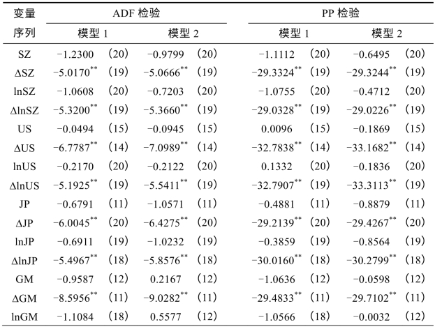 注:模型1仅含漂移。模型2既含漂移又含趋势项。滞后期数p的确定则用到了Ng and Perron(1995)方法,这里最大取值为20。ADF(τ)统计量检验临界值的响应面函数来源于MacKinnon(1991)。*表示在5%显著性水平下拒绝单位根的原假设,**则表示在1%显著性水平下拒绝单位根的原假设。