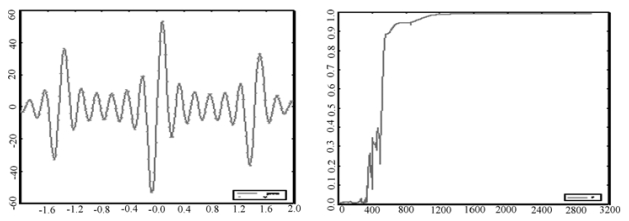 图7-7 左边为拟合图,曲线为逼近值,点为函数值;右图为适应度变化图