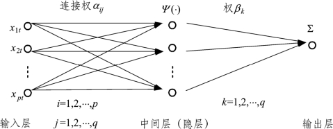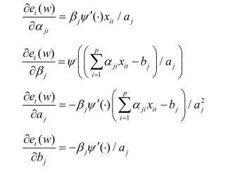 令w1×(p+3)q=(β1,…,βq,a1,…,aq,b1,…,bq,α11,…,α1q,α21,…,α2q,…,αp1,…,αpq)为小波神经网络的参数向量,其总误差为: