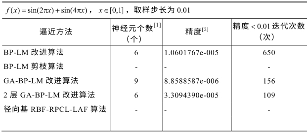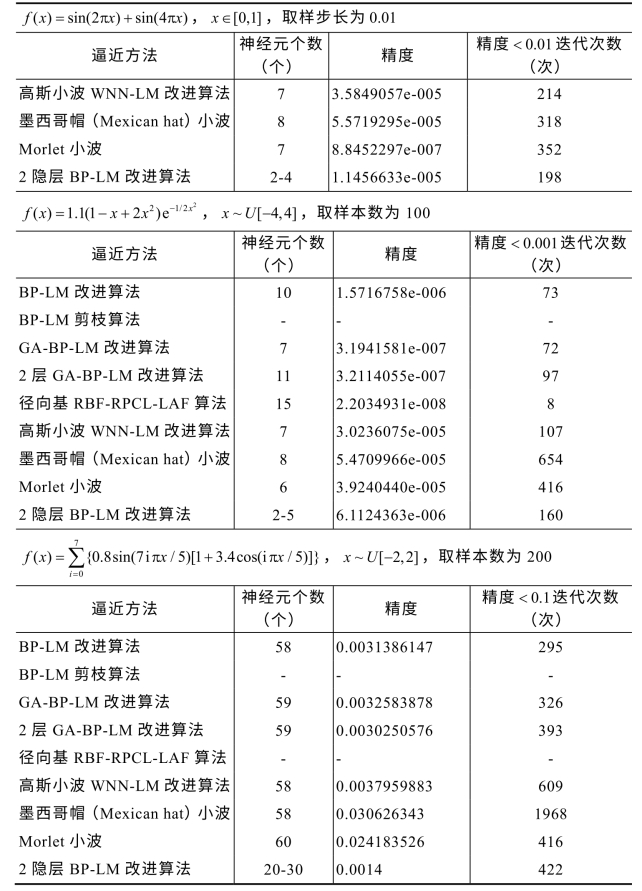 选取研究文献中给出的几类函数,应用BP-LM改进算法、BP-LM剪枝算法、GA-BP-LM改进算法、2层GA-BP-LM改进算法、径向基RBF-RPCL-LAF学习算法以及小波WNN-LM改进算法,进一步考察两隐层的BP网络的改进LM算法,迭代3000次,相应结果列表7-1如下: