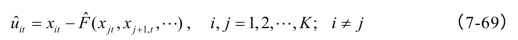 由式(7-9),利用神经网络方法估计其非线性函数,得到残差为:那么,由神经网络的逼近理论,单隐层神经网络即可析取变量间的非线性结构,则可进一步应用常规的单位根检验方法如ADF检验、SPSS检验及PP检验来确定残差序列是否平稳。若是非平稳的,则前述检验方法得到的结论有待进一步研究;若不存在单位根,则说明残差序列是平稳的,那么可以认为,原时间变量间存在非线性协整关系,而神经网络估计的函数形式可以作为非线性结构的一种近似估计量,从而可以进一步展开各种分析和预测研究。