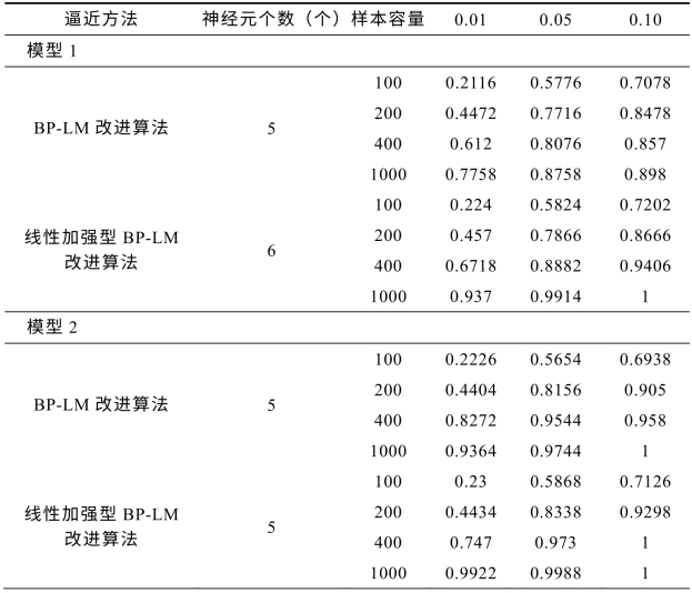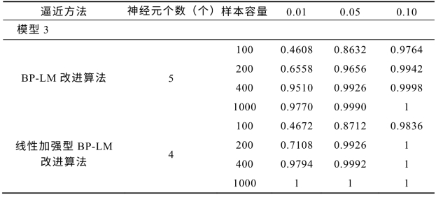 由表7-3可知,对于三种模型形式,两种算法均表现出良好的功效并随样本容量的增大而趋向100%,线性加强型BP-LM改进算法要优于BP-LM改进算法。