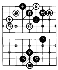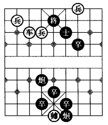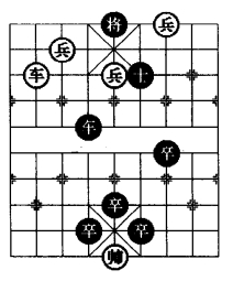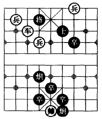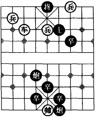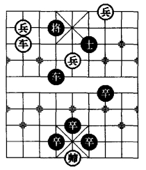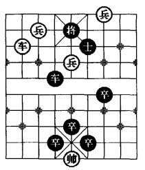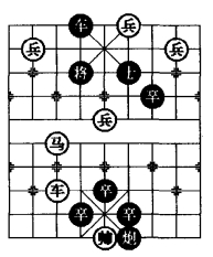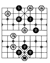 为了提高产着率,笔者又在图12 基础上采用图11 杀法,用减子法、移子法,将6·10 位黑炮删去,将7·4 位黑卒移至7·5位,将二·九位红兵移至二·十位;形成图13 棋图,这样使得着法合理、棋图美观,着法36 着,双方各七子,成为一则七子和局。