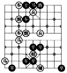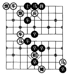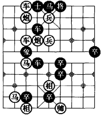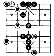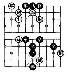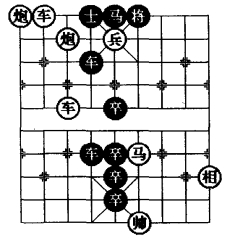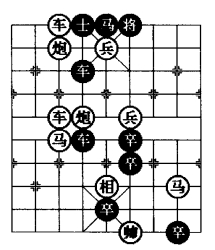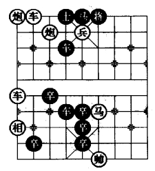 图3是在图1和图2“平车退炮防守型”的基础上采用移子、添子、删子的方法,特别是将黑5·5 位卒删除,在四·六位添植一红兵可以使着法提高4 着,这是棋局比较成功的改进。图3基本保持原图1和图2的综合方法,使其着法成为一则和局。