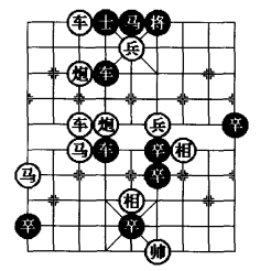 图13 是图11、图12 的一种扩展,仍然保留了弃车退炮防守的风格;也是此类系列棋局的衍生;笔者认为在6 着黑走前卒进1 而不走前卒平6,这种“双鬼把门”形式是着法向另外一种作局风格的迈进,图13 结尾也是一则单卒守和单马的实用残局形式。