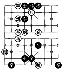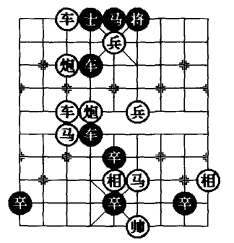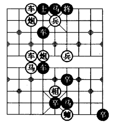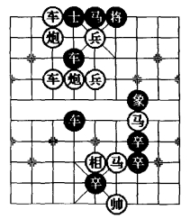 图10 是在综合图7、图8、图9的一些变化特点后,笔者认为在图7基础上添植一子,移动两子;或者在图8基础上减少两子,移动两子;或者在图9基础上减少两子移动三子;就成了图10 棋图的形式,并保持“平炮拦车防守型”形式。图10 的着法变化更加复杂,涉及棋规更强,精彩程度更高,虽然此局是一则和局,但它是一则创新的排局。