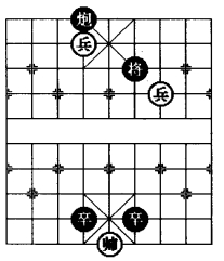 此局(图9)选自《蕉窗逸品》第10局,《蕉竹斋象棋谱》第107局也载有。演变着法会发现:图9是在图8着法结尾图形上红黑倒置再添加一路边兵而成,这样该局就成了红胜局。