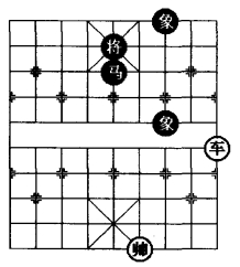 单车与马双象,后者必须达到唯一特定的中马、高象连环的局面下,才能成例和形势,术语称为“马三象”,其余的局面下都可以被单车“巧胜”,马因受步数限制,不如“炮三象”那么容易达到例和形势。今介绍“单车巧胜马双象”棋局如下: