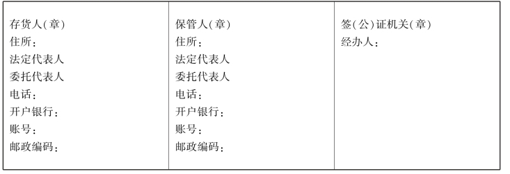 第八条 保管费率为________元/天·t,不足12 h 按半天计算;总保管费为________元。费用在货物交存保管的________天内交付给保管员保管到期前交付。结算办法:________
