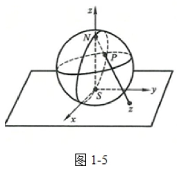 取一个球面,使之与复平面z相切于原点,球面上的一点S与原点重合,如(图1-5).通过点S作一条垂直于复平面的直线与球面交于另一点N,我们称N为北极,S为南极.