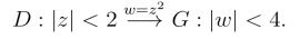 所以,函数w = z2把点z映射为点w时,w的模是z的模的平方,w的辐角是z的辐角增大一倍.显然,z平面上以原点为中心、2为半径的圆域D可通过该映射,变为w 平面上以原点为中心、4为半径的圆域G,即
