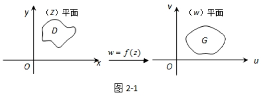 复变函数的几何表示.在高等数学中,我们常把实变函数(即自变量和因变量都是实变量的函数)用几何图形在直角坐标系或空间坐标系中表示出来,如常见的一元和二元实变函数的几何图形分别是平面曲线和空间曲面.我们借助这些几何图形,可以直观地理解和研究实变函数的一些性质.但是对一个复变函数来说,它反映了两对变量u,v和x,y之间的对应关系,因而无法借助同一个平面或同一个三维空间中的几何图形表示出来.我们观察到复变函数中有四个变量,因此可通过四维空间来描述,但从直观上不易于我们理解,所以我们借助两个复平面来表示点集之间的对应关系.如(图2-1),我们取两张复平面,分别为z平面和w平面,若以z平面上的点集D表示自变量z的取值范围,而以w平面上的点集G 表示函数值w的取值范围,那么w =f(z)确定了点集D和点集G之间的一个对应关系.