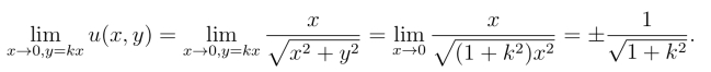 由此得u(x,y)=,v(x,y)=0.选取z →0的路径为y =kx,则有
