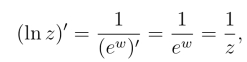 于是可知ln z在除去原点和负实轴的复平面内连续且单值.因为z = ew在区域-π <arg z ≤π 内的反函数w =ln z 是单值的,由反函数的求导法则可知