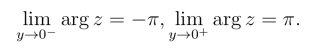 我们再来讨论对数函数的解析性.对于主值ln z =ln|z|+i arg z,ln|z|除原点外处处连续,arg z 在原点及负实轴上都不连续.因为设z = x+iy,则当x <0 时,有