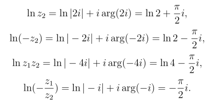 例3 设z1 =-2,z2 =2i,试计算下列复数z2,-z2,z1z2,的对数主值.