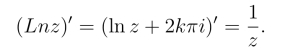 对于其他分支,由于它们之间仅差2πi的整数倍,因此在除去原点与负实轴的复平面内解析,且有相同的导数,即