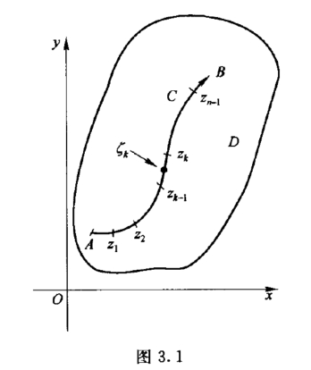 定义 设函数w = f(z)定义在区域D内,C为在区域D内起点为A,终点为B的一条光滑的有向曲线,把曲线C任意分成n个弧段,记分点为在每个弧段上任意取一点ζk(图3.1),并记作和式