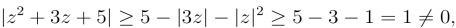 因此,函数z2+3z+5在单位圆周上及其内部无零点,从而被积函数在|z| =1及其内部解析,由柯西积分定理得