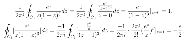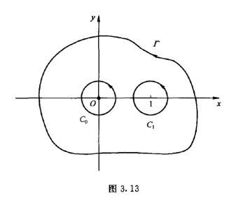 解 在Γ的内部以原点为中心作一个正向圆周C0,以1为中心作一个正向圆周(图3.13),则被积函数在由C,C0和C1所围成的区域内是解析的,根据复合闭路定理有