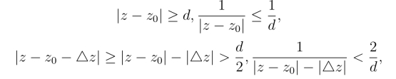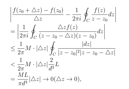 因为f(z)在C上是解析的,所以在C上连续,从而在C上是有界的.即存在一个正数M,使得在C上有|f(z)| ≤M.设d 为从z0到曲线C上各点的最短距离(图3.12),并取|△z|适当地小,使其满足则有