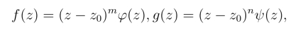 证明(1)由于z0分别为f(z)和g(z)的m,n级零点,故存在函数φ(z)和ψ(z)在点z0解析,且φ(z0)0,ψ(z0)