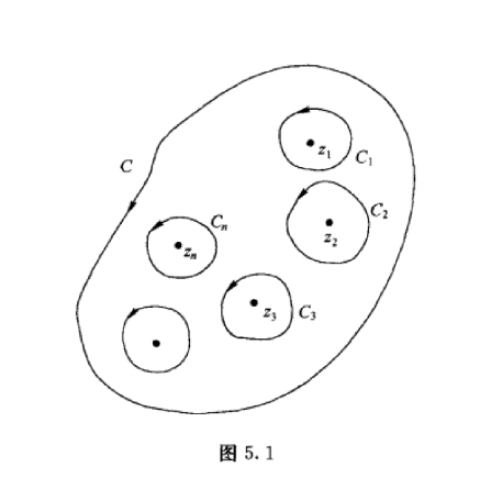 证明 在C的内部围绕每个奇点zk作互不包含的正向小圆周Ck,k =1,2,··· ,n(图5.1),根据复合闭路定理有