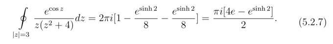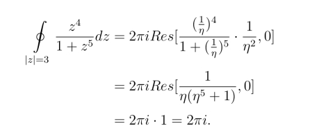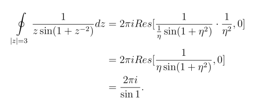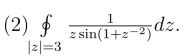 解 (1)被积函数的五个奇点都在|z|=3的内部.若使用定理1,要计算五个奇点的留数,比较麻烦,故使用定理2.