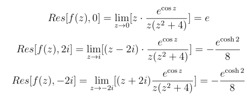 解 f(z) =在|z| = 3的内部有三个一级极点z = 0,z = 2i,z =-2i.